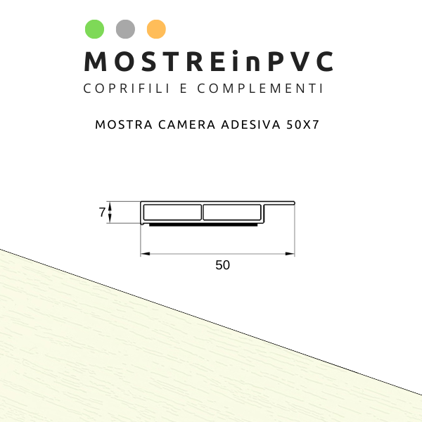 Mostra camera in PVC di larghezza 50mm e sporgenza 7mm dotate di adesivo per la posa in opera.