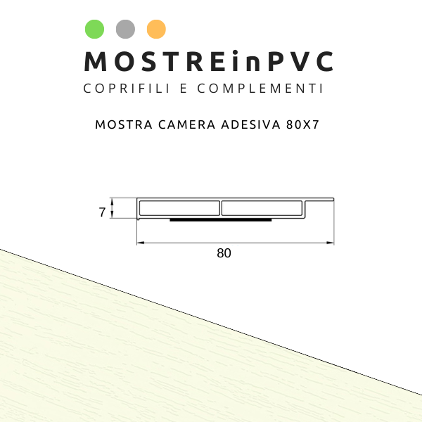 Mostra camera in PVC di larghezza 80mm e sporgenza 7mm dotate di adesivo per la posa in opera.